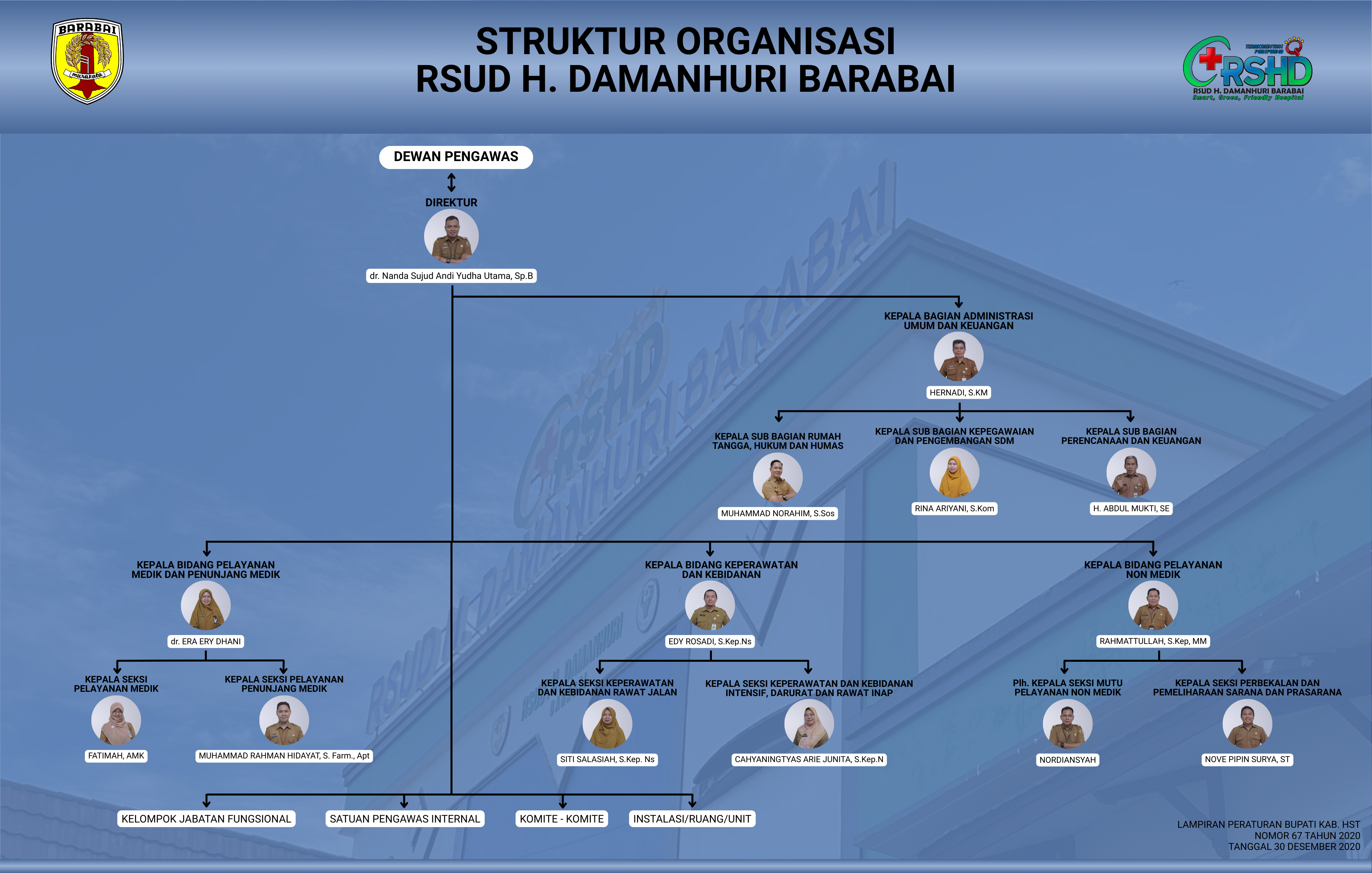 Struktur organisasi Rumah Sakit Umum Daerah H. Damanhuri Barabai berdasarkan Peraturan Bupati (Perbup) Nomor 67 Tahun 2020 tentang Pembentukan, Susunan Organisasi, Tugas dan Fungsi Tata Kerja Unit Pelaksana Teknis Rumah Sakit Umum Daerah Sinja Haji Damanhuri Barabai pada Dinas Kesehatan Kabupaten Hulu Sungai Tengah.